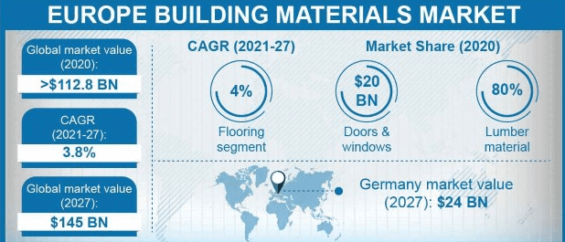 The Europe Building Materials Market was worth more than USD 110 billion in 2020, and it is expected to grow at a 3.8 percent CAGR from 2021 to 2027. The increasing number of applications for lumber and panel products is expected to drive industry growth.